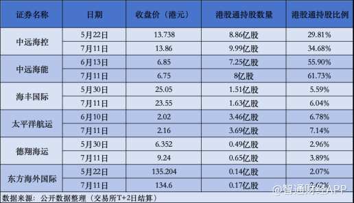 以中远海控为例,5月22日,港股通持股数量为8.86亿股,持股比例为29.81%;到7月11日,港股通持股数量增至9.99亿股,持股比例上升至34.68%。中远海能在6月13日港股通持股数量为7.25亿股,持股比例55.90%,7月11日持股数量达到8亿股,持股比例提升至61.73%。太平洋航运在6月10日港股通持股数量为3.46亿股,持股比例6.78%,7月11日持股数量增至3.69亿股,持股比例7.14%。海丰国际、德翔海运、东方海外国际等也自5月下旬以来获得南向资金不同程度加仓。
