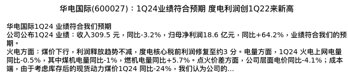 值得注意的是:2024年04月中金公司的刘佳妮/陈显帆/刘砺寒分析师,首次发布关于华电国际的研究报告,标题为:华电国际(600027):1Q24业绩符合预期 度电利润创1Q22来新高。