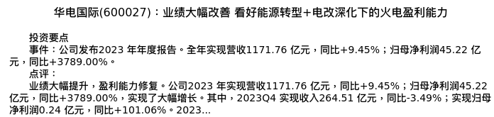 值得注意的是:2024年04月华金证券的张文臣/周涛/申文雯分析师,首次发布关于华电国际的研究报告,标题为:华电国际(600027):业绩大幅改善 看好能源转型+电改深化下的火电盈利能力。