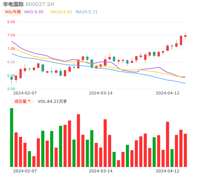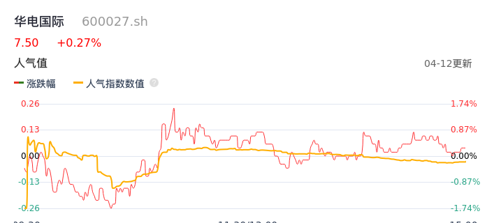 04月12日,华电国际收报7.50,股价涨幅0.27%,成交金额4.80亿元,换手率0.75%。