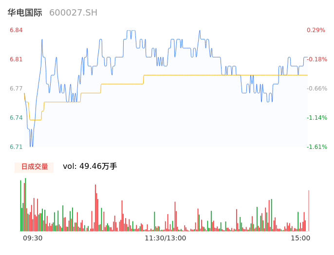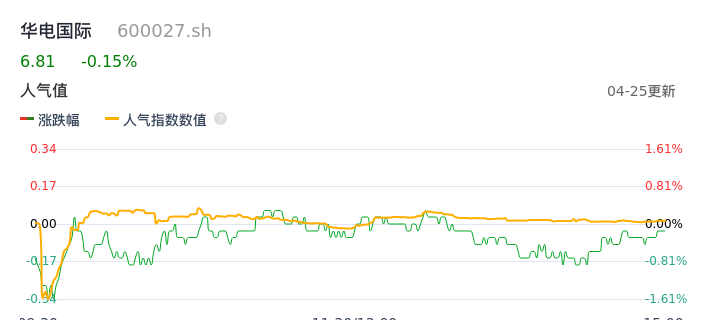 04月25日,华电国际收报6.81,股价涨幅-0.15%,成交金额3.36亿元,换手率0.58%。