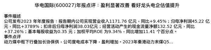 值得注意的是:2024年04月山西证券的分析师,首次发布关于华电国际的研究报告,标题为:华电国际(600027)年报点评:盈利显著改善 看好龙头电企估值提升。