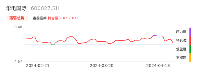 我们来看一下该股的九方特色指标强弱趋势的情况:华电国际自04月12日从压力区回到持仓区。股价近期持续调整。后续重点关注能否站稳多空分界点:7.03元。如被有效击穿则将进入空头行情。