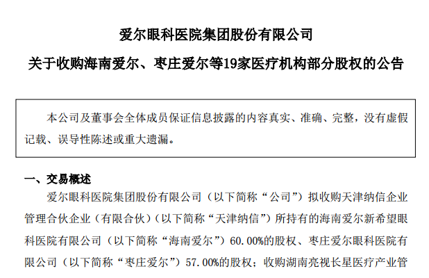 近日,“眼茅”爱尔眼科又有新动作。9月20日,公司公告称拟8.6亿收购海南爱尔、枣庄爱尔等19家医疗机构部分股权,加速布局下沉市场。19家医疗机构中16家今年1-7月均实现盈利,如交易金额最大的昆明艾维眼科医院今年前7月实现净利润为1433万元。