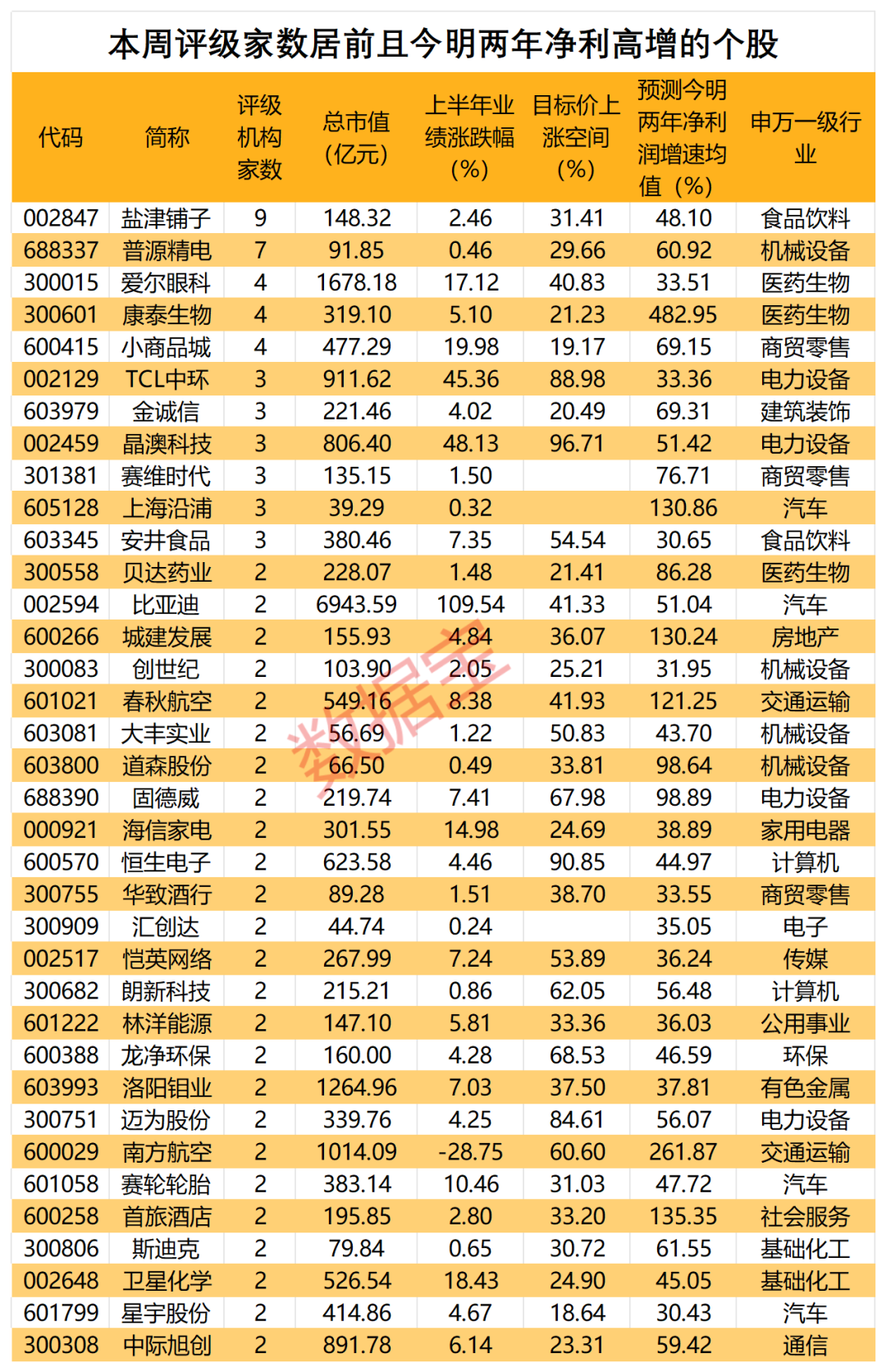全球缝制设备龙头杰克股份二季度业绩出现改善。财报显示,公司第二季度归母净利润达1.6亿元,同比增长30.9%,环比增长41.3%,营收降幅也较第一季度有所收窄。华泰证券将公司评级调高至“买入”,最高目标价为27.54元。
