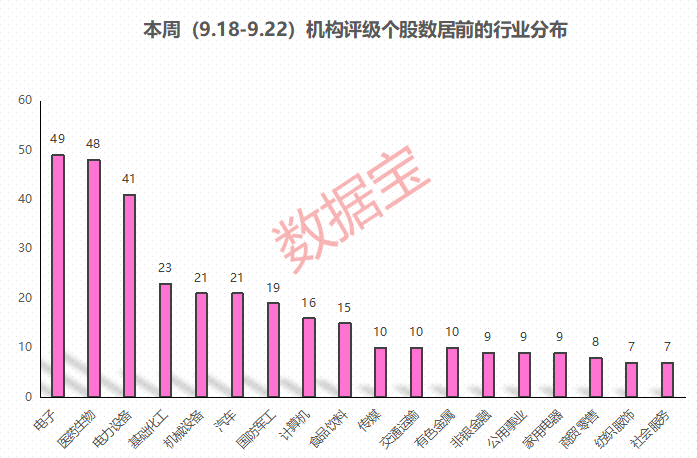 本周海通证券、中信证券、长城证券对个股的评级数量排名前三,均超35家。从申万一级行业来看,电子行业有49股获评级,位居首位;医药生物有48股,次之;电力设备有41股上榜,排名第三。
