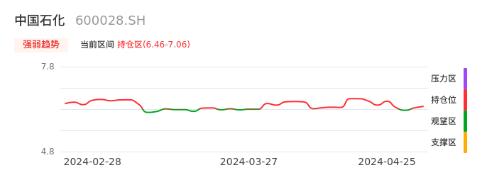 我们来看一下该股的九方特色指标强弱趋势的情况:中国石化近日从观望区上穿到持仓区。股价短期站稳多头区域,上升动能仍较为充足,可积极关注。后续重点关注上方压力位:7.06元是否能突破上攻。