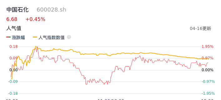 04月16日,中国石化收报6.68,股价涨幅0.45%,成交金额14.92亿元,换手率0.24%。