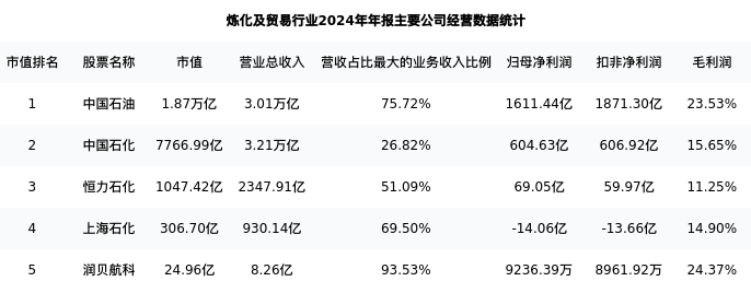中国石化最新报告期数据为年报,下表汇总了炼化及贸易行业内市值靠前的公司年报主要经营数据