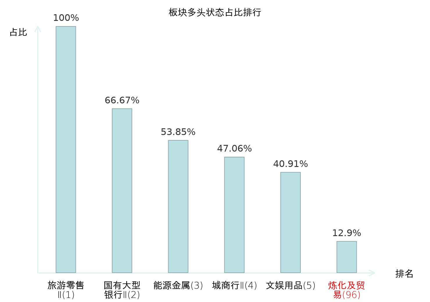全市场所有行业板块中主力多头状态占比排名中,旅游零售Ⅱ板块位居第一。保险Ⅱ板块名次提升最快,较昨日上升57位。