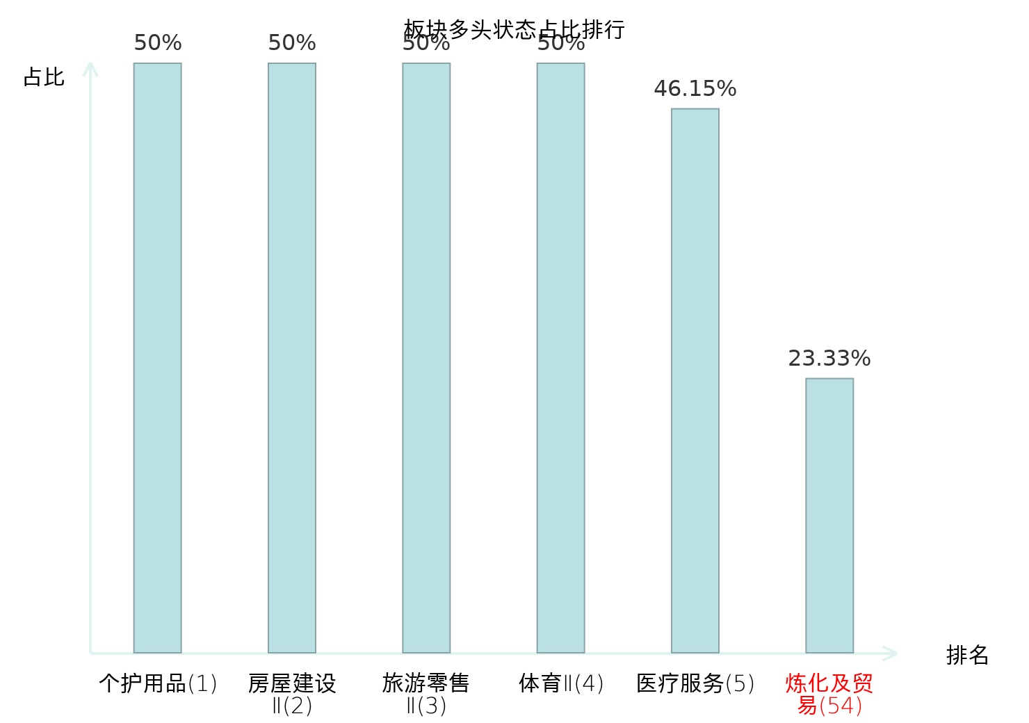 全市场所有行业板块中主力多头状态占比排名中,个护用品板块位居第一。影视院线板块名次提升最快,较昨日上升56位。