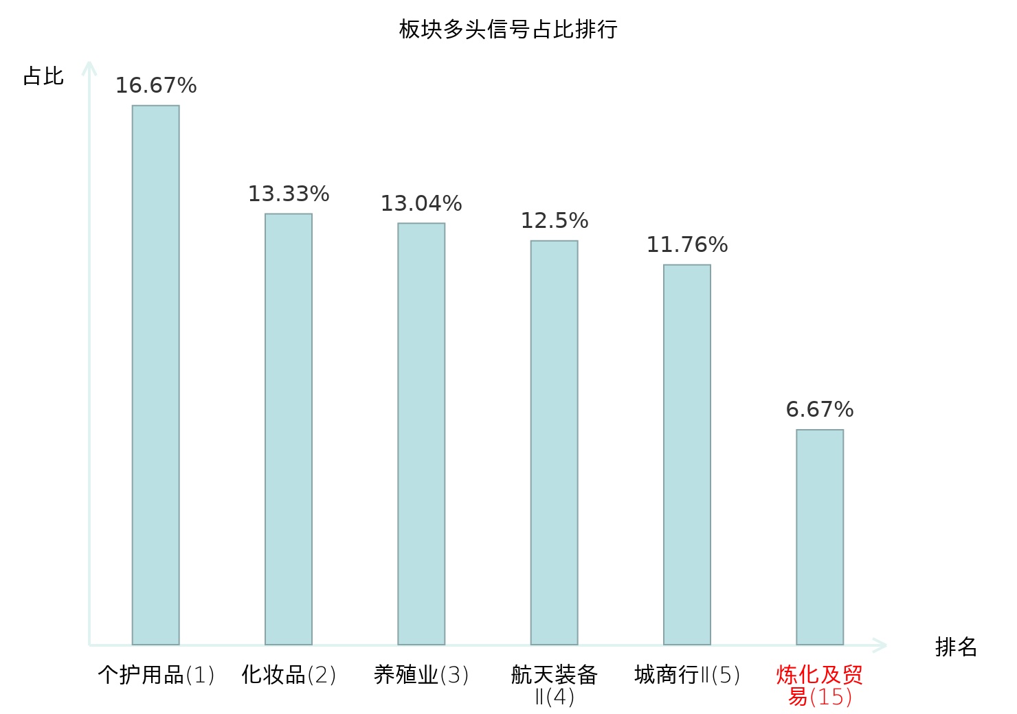 全市场所有行业板块中主力多头信号占比排名中,个护用品板块位居第一。航天装备Ⅱ板块名次提升最快,较昨日上升118位。