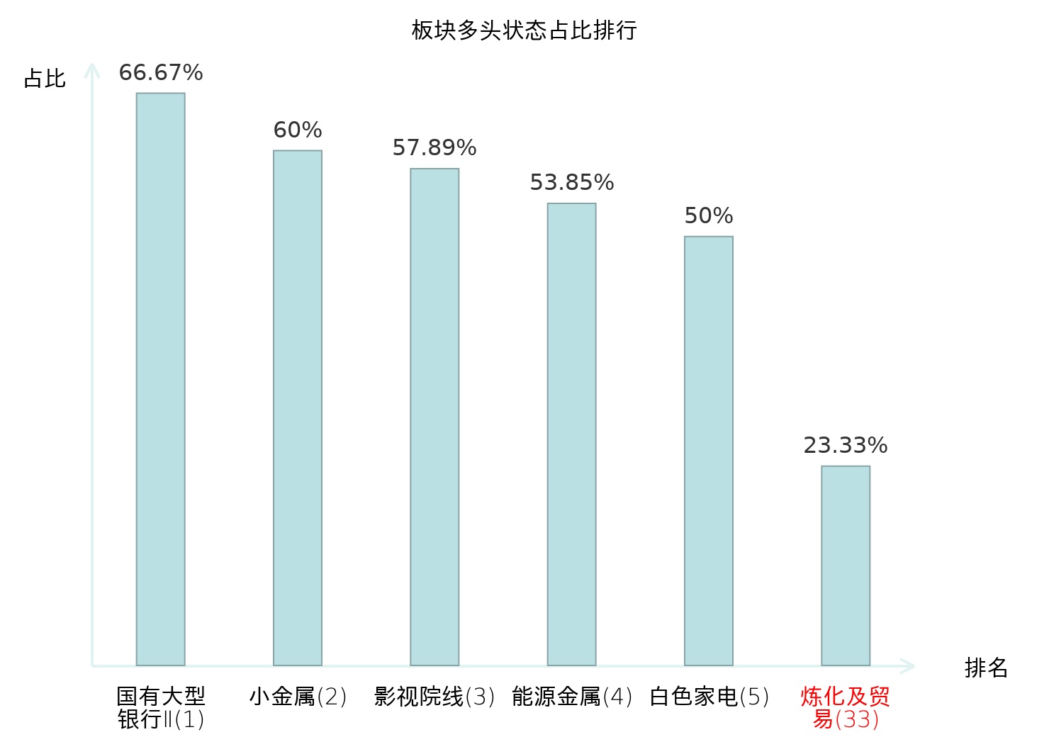 全市场所有行业板块中主力多头状态占比排名中,国有大型银行Ⅱ板块位居第一。装修装饰Ⅱ板块名次提升最快,较昨日上升48位。