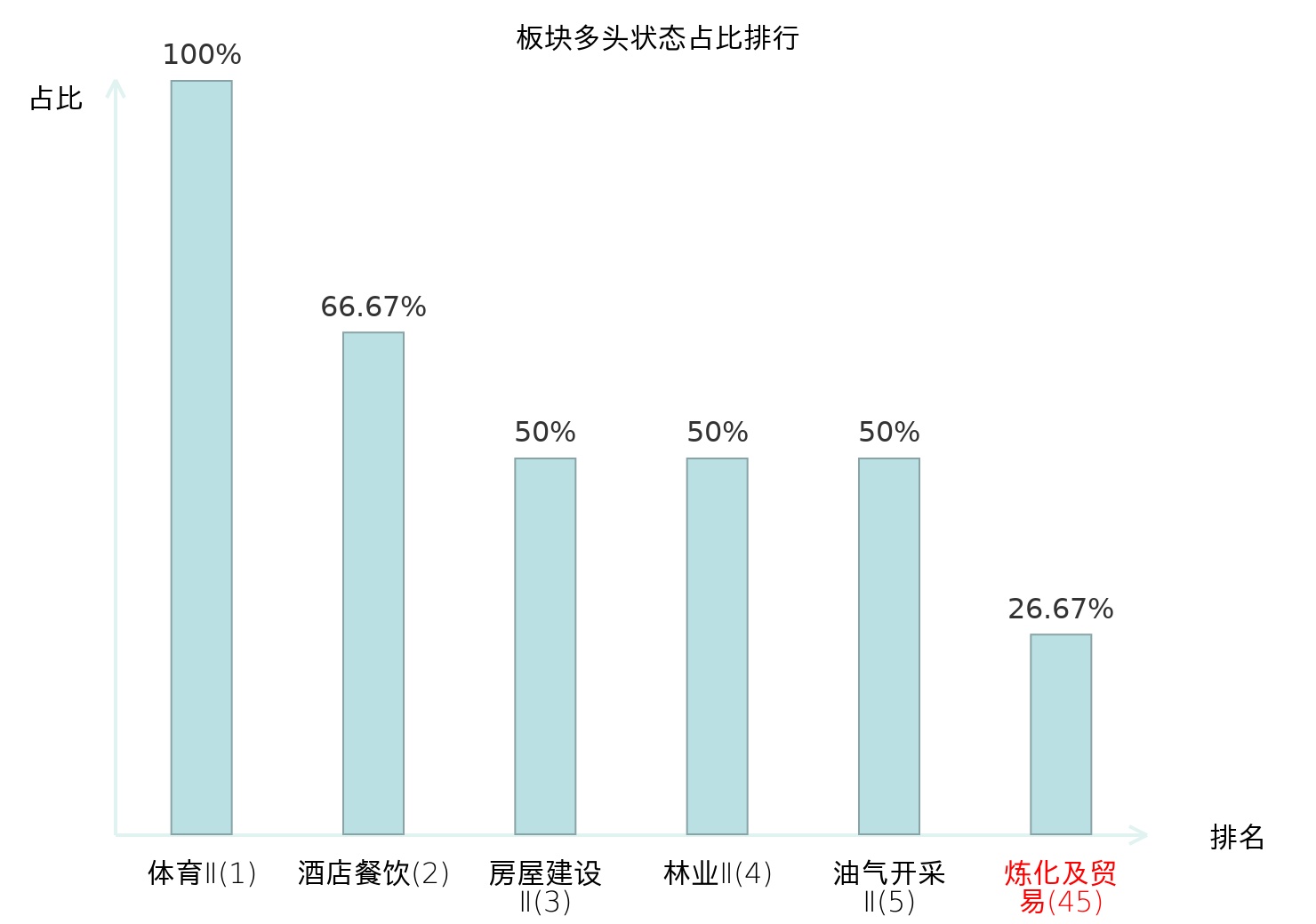 全市场所有行业板块中主力多头状态占比排名中,体育Ⅱ板块位居第一。国有大型银行Ⅱ板块名次提升最快,较昨日上升100位。