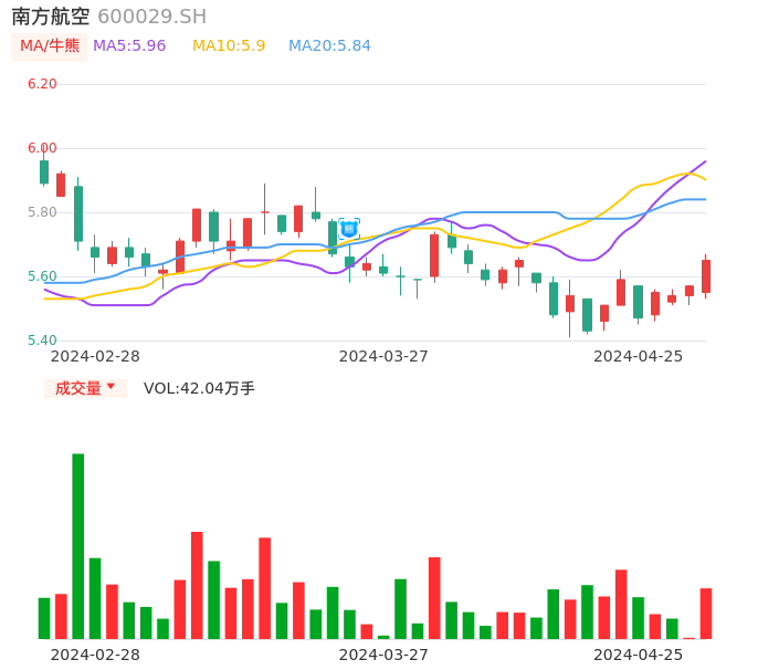 04月25日,南方航空收报5.65,股价涨幅1.44%,成交金额2.37亿元,换手率0.33%。