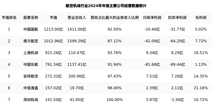 南方航空最新报告期数据为年报,下表汇总了航空机场行业内市值靠前的公司年报主要经营数据