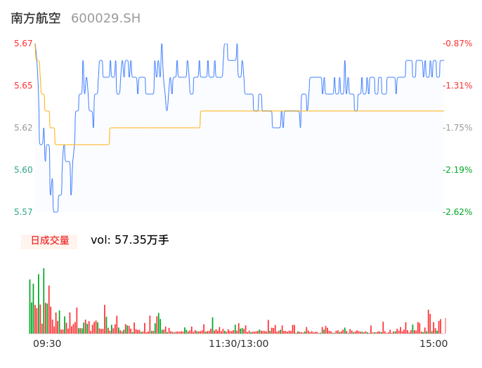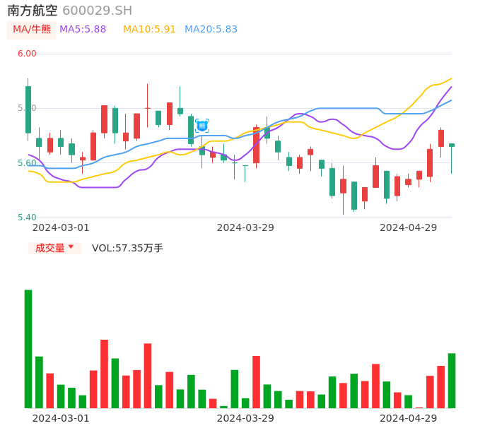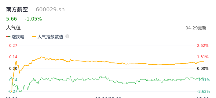 04月29日,南方航空收报5.66,股价涨幅-1.05%,成交金额3.23亿元,换手率0.45%。