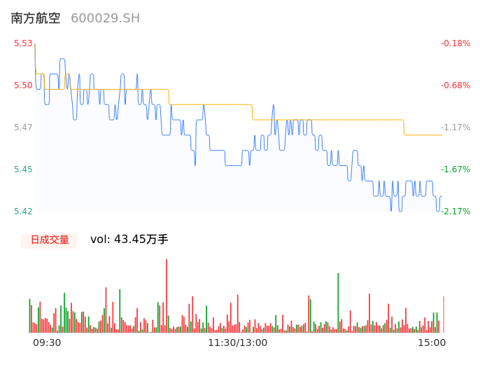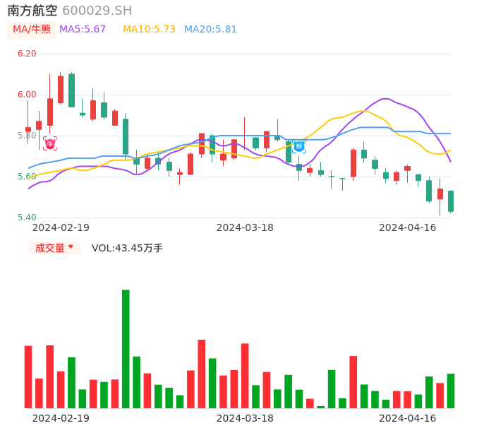 04月16日,南方航空收报5.43,股价涨幅-1.99%,成交金额2.38亿元,换手率0.34%。