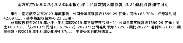 值得注意的是:2024年04月西部证券的凌军分析师,首次发布关于南方航空的研究报告,标题为:南方航空(600029)2023年年报点评:经营数据大幅修复 2024盈利改善弹性可期。