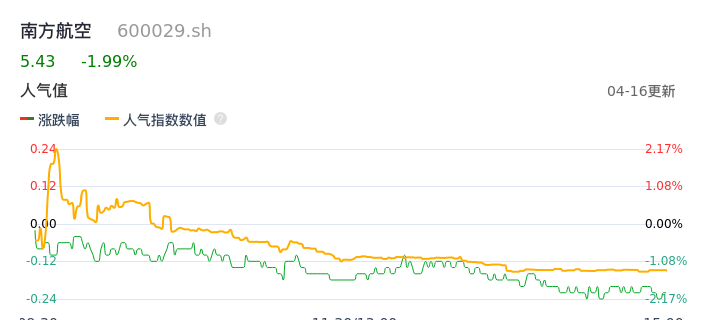 04月16日,南方航空收报5.43,股价涨幅-1.99%,成交金额2.38亿元,换手率0.34%。