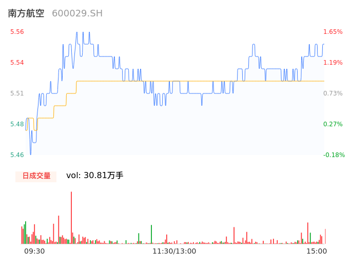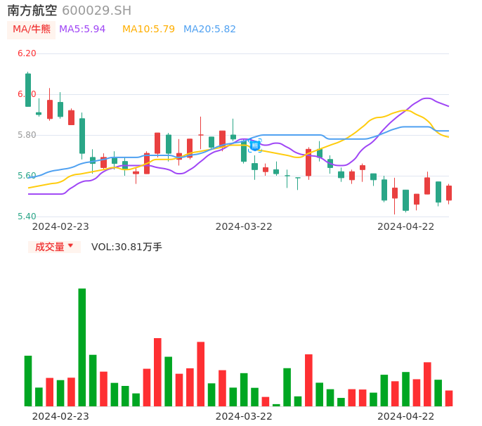 04月22日,南方航空收报5.55,股价涨幅1.46%,成交金额1.70亿元,换手率0.24%。