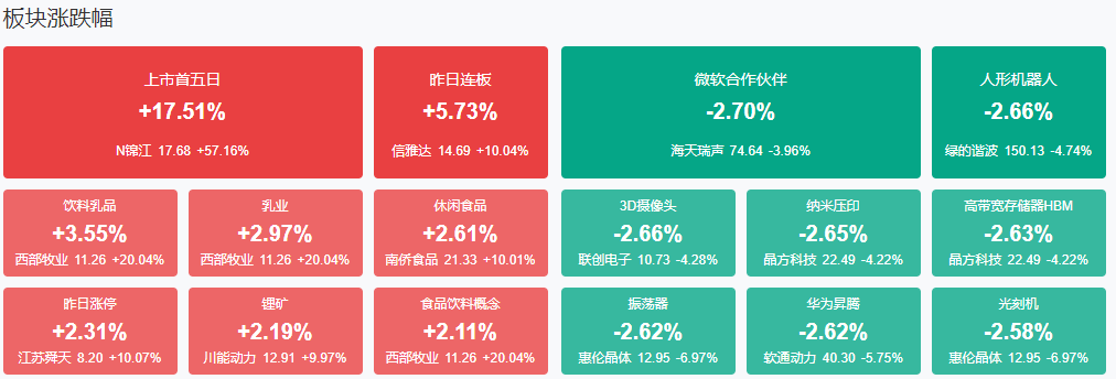 板块方面,食品加工、预制菜、养鸡、贸易等板块涨幅居前,华为昇腾、光刻机、存储芯片、手机游戏等板块跌幅居前。