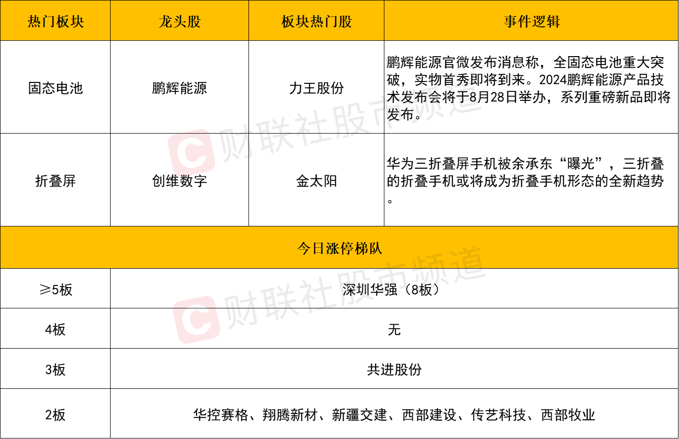 板块上,固态电池概念涨幅居前,翔丰华、三祥新材、传艺科技、东方锆业、圣阳股份涨停,鹏辉能源、天力锂能、孚能科技等个股涨超10%。