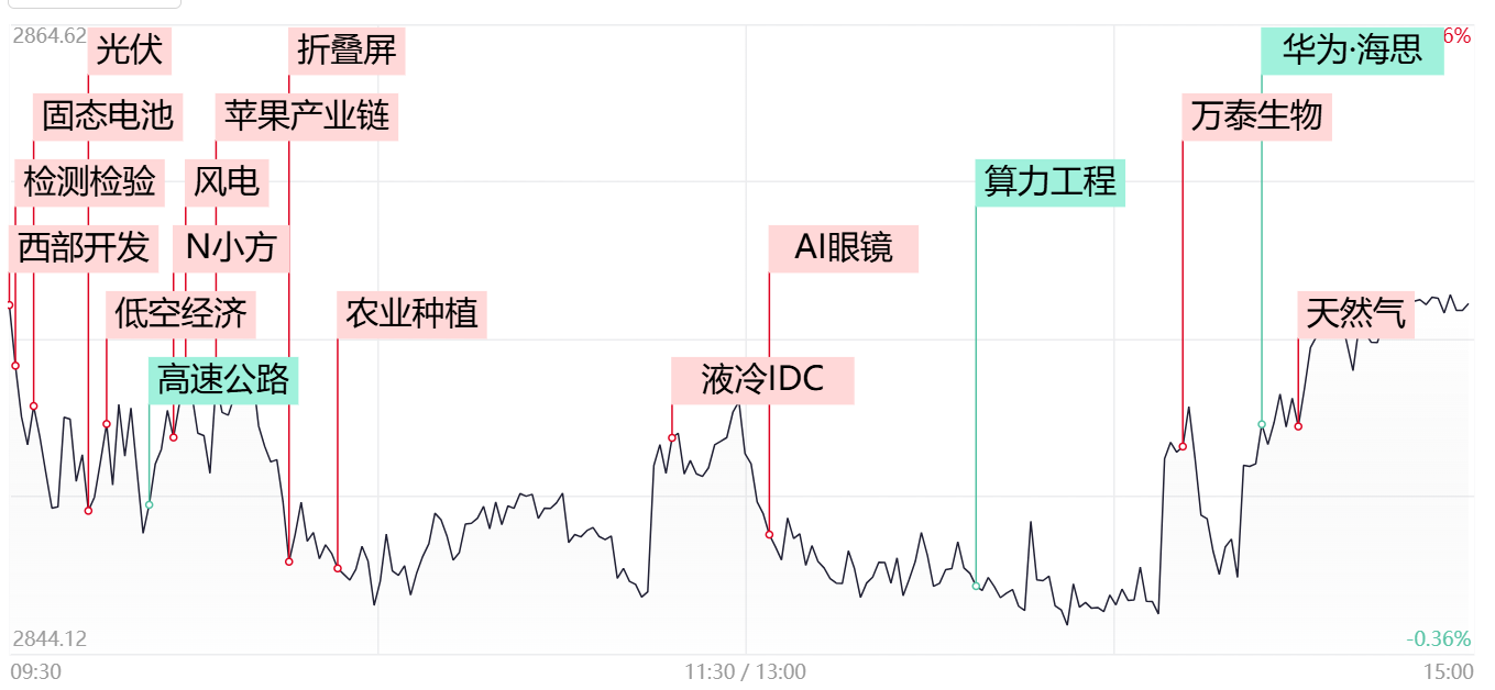 ①市场全天震荡分化,三大指数涨跌不一。其中固态电池板块领涨两市,折叠屏概念盘中拉升,此外西部开发、房屋检测、AI眼镜、天然气等方向也于盘中轮番活跃;