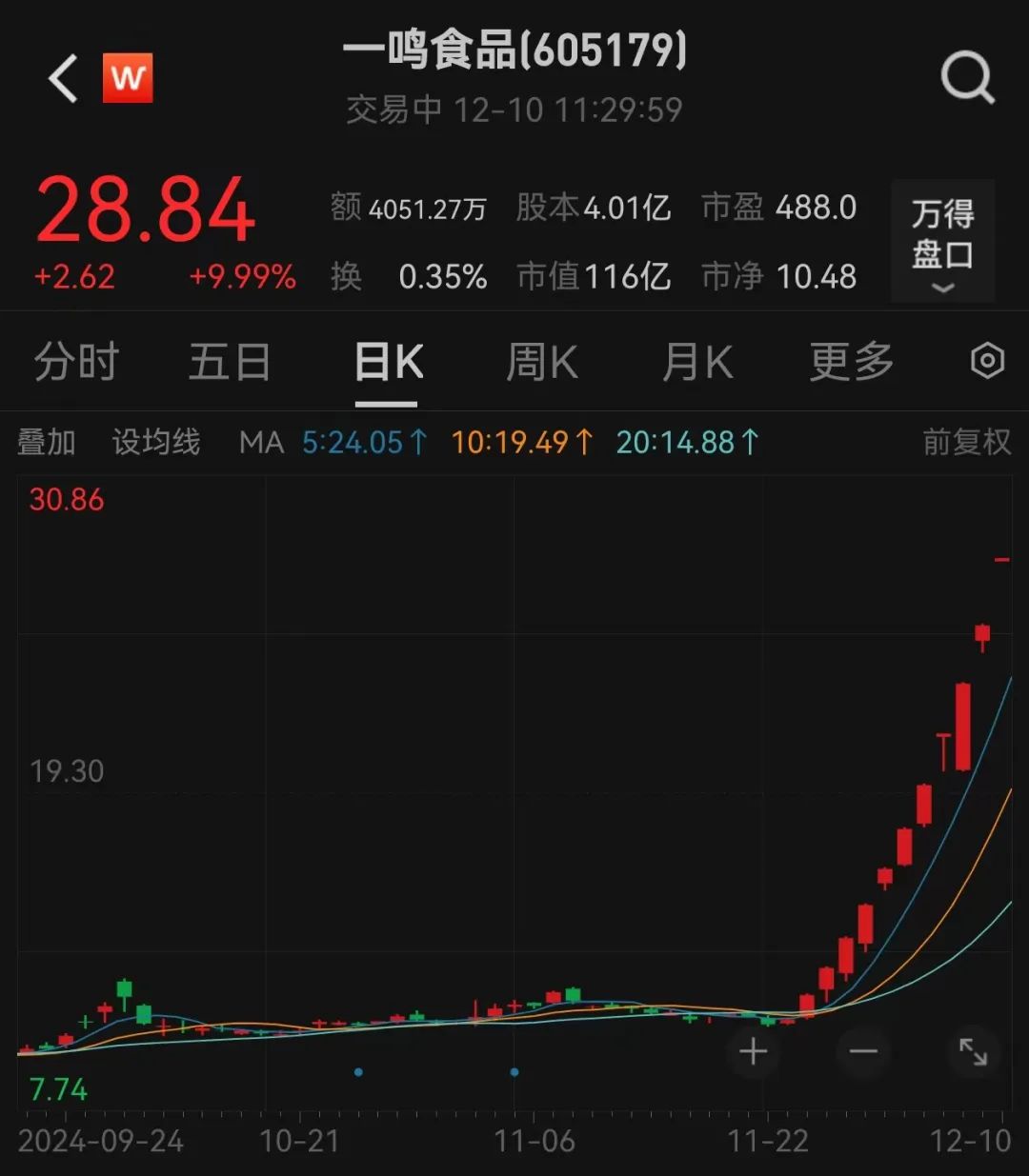 截至上午收盘,当前连续涨停板最多的股票是一鸣食品,该股早盘一字涨停,已连续收获11个涨停板,最新股价创历史新高。一鸣食品主营业务为新鲜乳品与烘焙食品的研发、生产、销售及连锁经营业务。今年前三季度,公司实现净利润0.37亿元,同比增长4.13%。