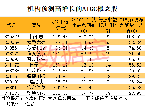 未来增长潜力方面,哪些公司值得期待?券商研报或能提供一定参考。据统计,根据5家以上机构一致预测,2024年—2026年净利润增速均有望超20%的AIGC概念股有11只。