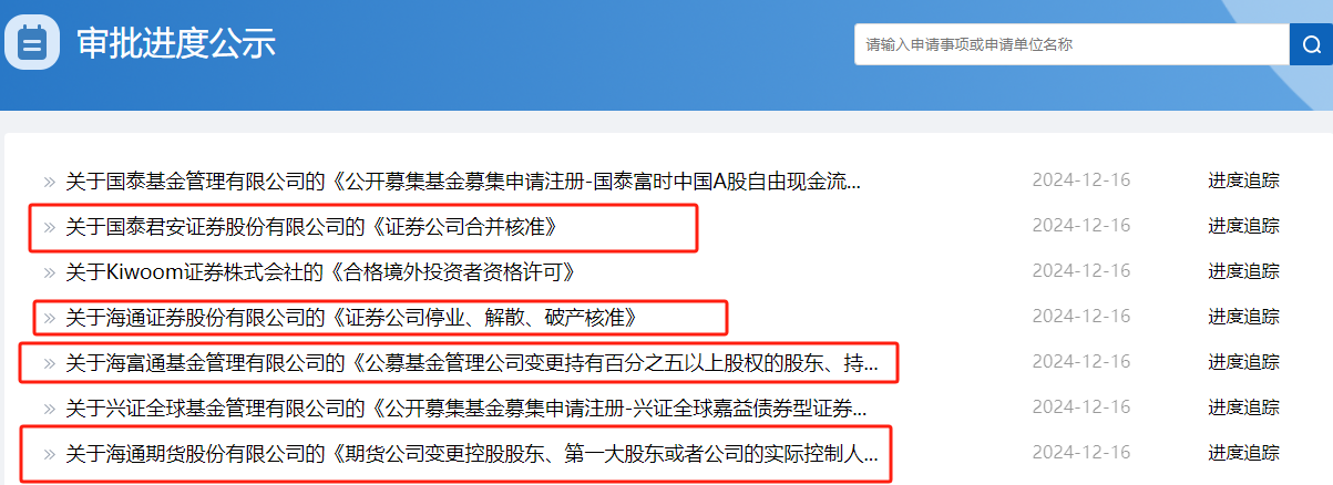 据证监会网站审批进度公示,关于国泰君安证券的《证券公司合并核准》,海通证券的《证券公司停业、解散、破产核准》,海通期货的《期货公司变更控股股东、第一大股东或者公司的实际控制人许可》以及富国基金、海富通基金的《公募基金管理公司变更持有百分之五以上股权的股东、持股不足百分之五但对公司治理有更大影响的股东或者实际控制人审批》,均在12月16日被监管接收相关材料。