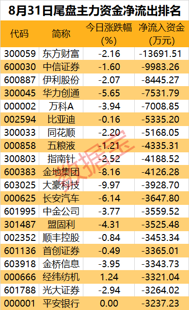 其后中信证券、伊利股份、华力创通、万科A、比亚迪、同花顺尾盘净流出金额居前,均超5000万元。