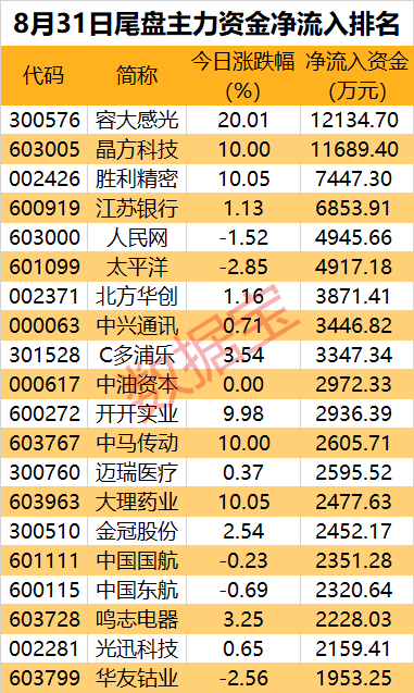 从个股看,有19股尾盘净流入资金超2000万元,容大感光、晶方科技尾盘均获加仓超1亿元。