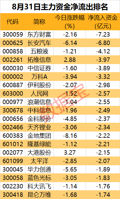 数据宝统计,49股遭主力资金净流出超1亿元。互联网券商龙头东方财富和汽车股长安汽车资金流出居前,全天分别净流出7.23亿元、6.8亿元。