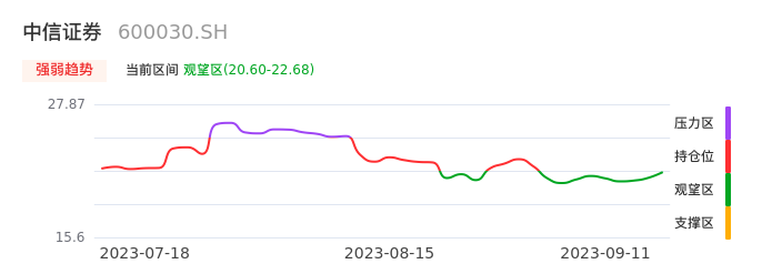 我们来看一下该股的九方特色指标强弱趋势的情况:中信证券自08月30日从持仓区下穿到观望区。股价近期持续下跌后,短期出现止跌迹象。后续重点关注能否再次站上多空分界点:22.68元。如未能有效突破则可能进入新一轮空头行情。
