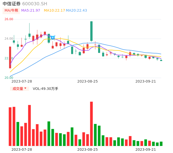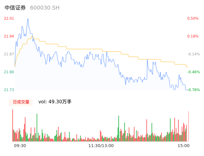 09月21日,中信证券收报21.73,股价涨幅-0.78%,成交金额10.76亿元,换手率0.43%。
