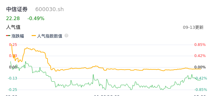 09月13日,中信证券收报22.28,股价涨幅-0.49%,成交金额12.45亿元,换手率0.49%。
