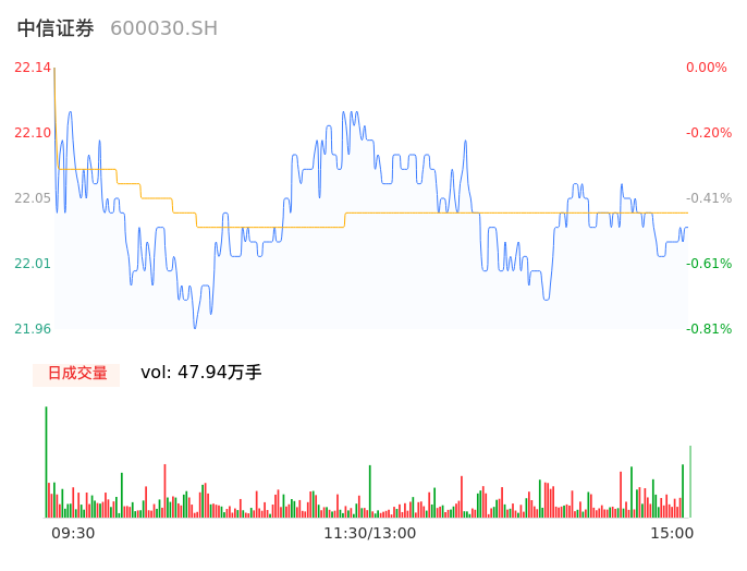 09月19日,中信证券收报22.02,股价涨幅-0.54%,成交金额10.56亿元,换手率0.42%。