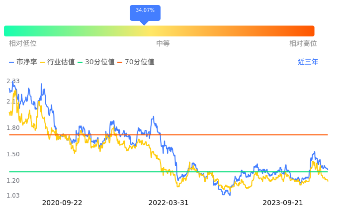 中信证券当前市净率PB为1.36,在所属的证券中,市净率PB排31,前五名分别为海通证券市净率0.79、国元证券市净率0.88、国泰君安市净率0.91、长江证券市净率0.94、华创云信市净率0.95。中信证券当前市净率PB为1.32,超过近3年34.07%的历史数据。