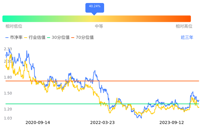 中信证券当前市净率PB为1.36,在所属的证券中,市净率PB排29,前五名分别为海通证券市净率0.80、华创云信市净率0.87、国元证券市净率0.90、国泰君安市净率0.93、哈投股份市净率0.97。中信证券当前市净率PB为1.36,超过近3年40.24%的历史数据。