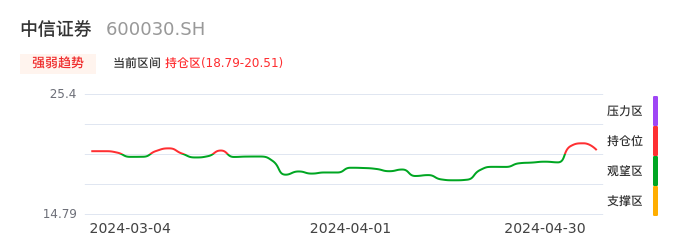 我们来看一下该股的九方特色指标强弱趋势的情况:中信证券近日从观望区上穿到持仓区。股价短期站上多头区域,但还未完全站稳。后续重点关注多空分界点的争夺:18.79元。如未能有效站稳则可能重新回到空头行情。