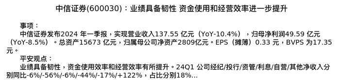 值得注意的是:2024年04月平安证券的王维逸/李冰婷/韦霁雯分析师,首次发布关于中信证券的研究报告,标题为:中信证券(600030):业绩具备韧性 资金使用和经营效率进一步提升。