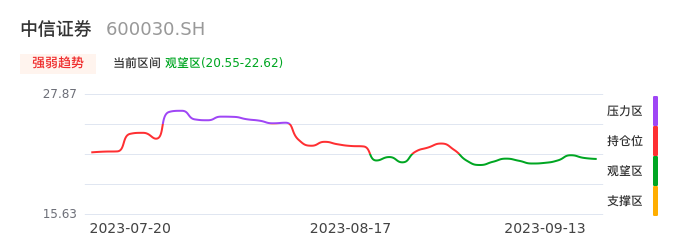 我们来看一下该股的九方特色指标强弱趋势的情况:中信证券自08月30日从持仓区下穿到观望区,股价近期持续走弱。短期已经进入空头行情,且下跌动能仍未衰竭。建议继续谨慎观望。