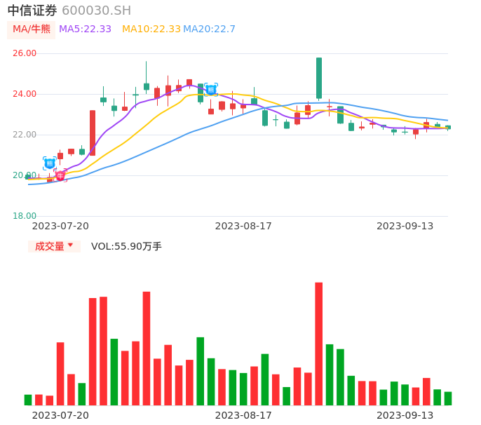 值得注意的是:2023年09月信达证券的王舫朝/冉兆邦分析师,首次发布关于中信证券的研究报告,标题为:中信证券(600030):投行、信用表现亮眼 看好杠杆提增空间。
