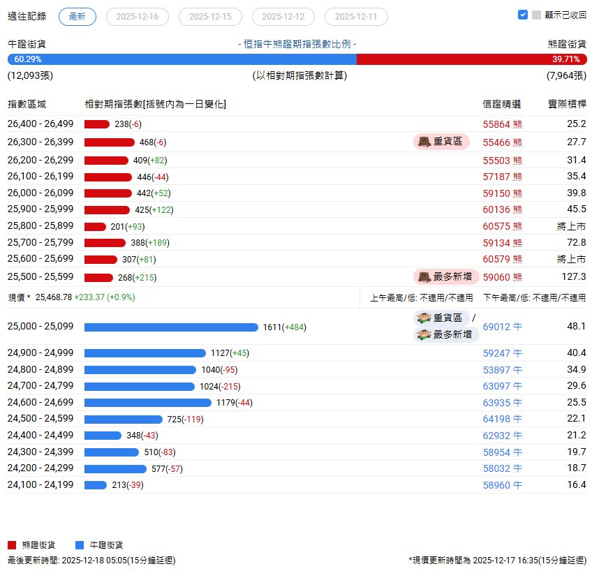 智通财经APP获悉,截至12月18日,恒指最新的牛熊街货比例为60:40。