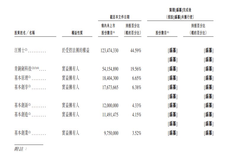 青铜剑科技由(a)汪博士直接拥有40.85%的权益;(b)青铜剑控股(由汪博士作为其普通合伙人控制)拥有27.35%的权益;(c)英伦博智拥有19.57%的权益,而英伦博智由汪博士拥有13.00%的权益,并由汪博士的母亲王永苗女士拥有25.00%的权益;及(d)王永苗女士拥有12.23%的权益。根据汪博士与英伦博智订立的一致行动人士协议,他们同意就其于青铜剑科技的股东权利采取一致行动(包括投票和提出决议),且若出现意见分歧,概以汪博士的意见为准。
