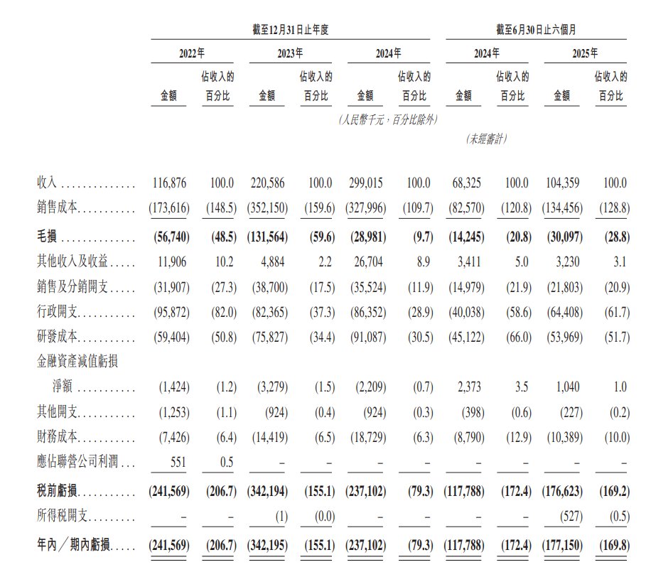 于2022年度、2023年度、2024年度及2025年截至6月30日止六个月,公司分别录得年内/期内亏损2.42亿元、3.42亿元、2.37亿元及1.77亿元。