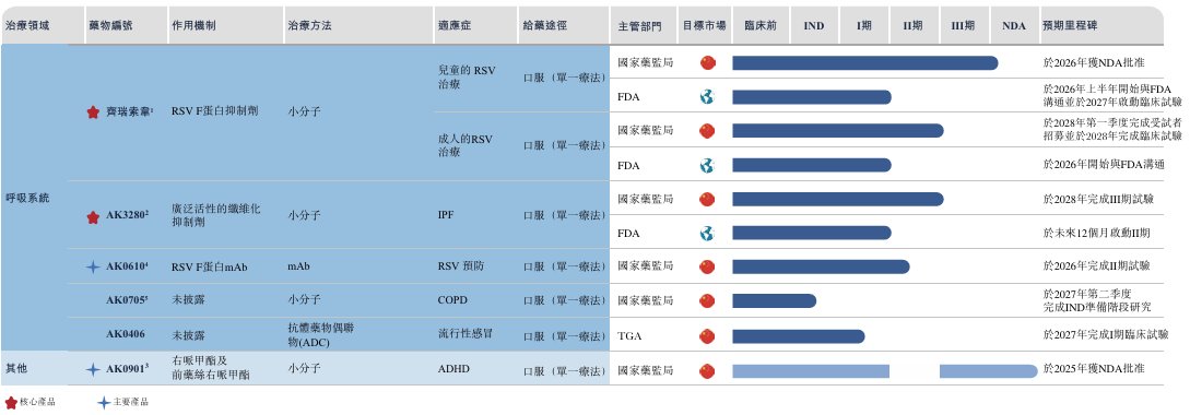 据招股书,该公司是一家于2013年成立的生物制药公司,专注于发现和开发疗法,解决呼吸系统和儿科疾病的医疗需求。该公司已开发六种候选药物的管线,包括两项核心产品,即(i)齐瑞索韦,一种呼吸道合胞病毒(RSV)药物,最初于2014年1月从罗氏公司获得许可引进,目前正在处于国家药品监督管理局(国家药监局)的新药申请(NDA)审评阶段,用于治疗1至24个月婴幼儿的RSV感染;及(ii)AK3280,一种处于II期后概念验证(PoC)临床试验阶段的特发性肺纤维化(IPF)药物,最初于2018年8月从罗氏、基因泰克及Intermune获得许可引进。