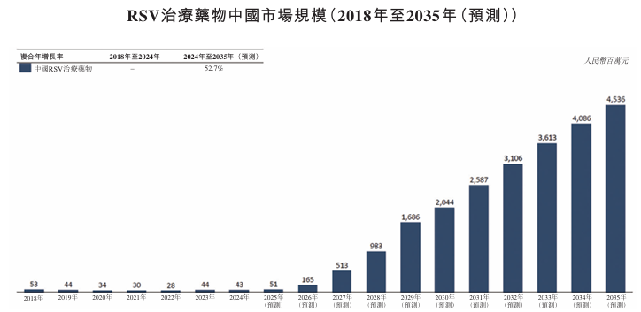 尽管过往并无已获批专门靶向RSV感染的治疗药物,但利巴韦林作为一种并非专门靶向RSV的广谱抗病毒药物已获批用于RSV治疗。由于对其潜在毒性、有限及不可预测的疗效以及相关不便及高成本的担忧,过往的RSV治疗药物市场相对较小。随着专门靶向RSV感染的治疗药物预期获批,全球RSV治疗药物市场预计将显著增长。RSV药物整体全球市场(包括治疗药物及预防药物)近年来快速发展。根据灼识咨询报告,RSV治疗药物市场截至2024年仅录得3000万美元,预计2026年将达到8.19亿美元。此后,RSV治疗药物市场预计将迅速增加至2035年的86亿美元,2024年至2035年的复合年增长率为67.1%。在美国,RSV治疗药物市场预计将由2024年的240万美元大幅增长至2030年的24亿美元,并进一步增长至2035年的37亿美元,2024年至2035年的复合年增长率为52.7%。