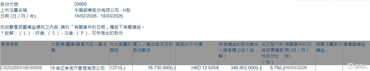 格隆汇3月18日丨根据联交所最新权益披露资料显示,2026年3月16日,中国铝业(02600.HK)遭中信证券资产管理有限公司在场内以每股均价12.9254港元减持1973万股,涉资约2.55亿港元。